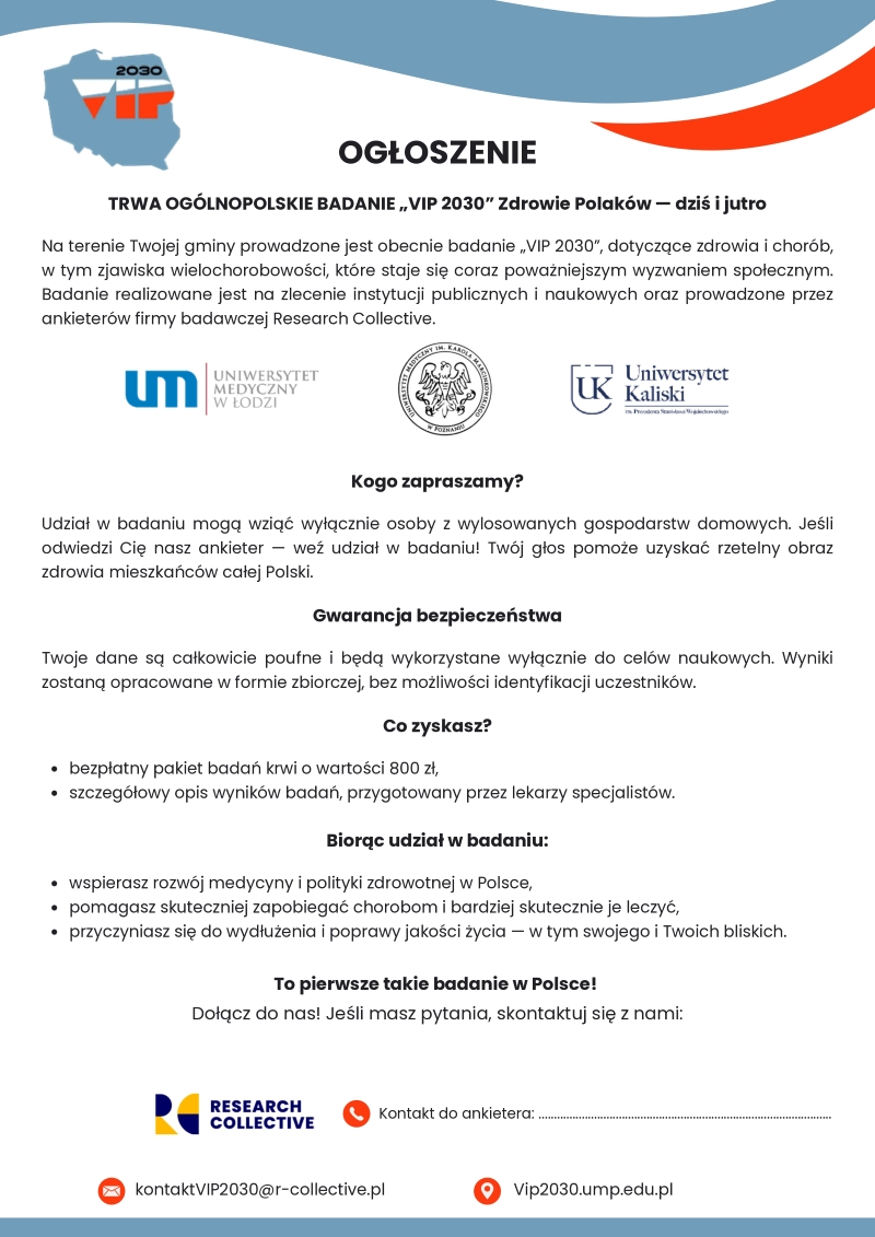 Mieszkańcy wylosowani z bazy TERYT są odwiedzani przez wykwalifikowanych ankieterów i otrzymują zaproszenie do bezpłatnego udziału w kompleksowych badaniach zdrowotnych. To wyjątkowa okazja dla lokalnej społeczności, aby skorzystać z nowoczesnej diagnostyki medycznej, która na co dzień jest bardzo kosztowna i trudno dostępna. Każdy uczestnik otrzymuje szczegółowe wyniki badań wraz z indywidualnymi zaleceniami zdrowotnymi. Udział mieszkańców naszej gminy w tym prestiżowym projekcie badawczym przyczynia się nie tylko do poprawy ich stanu zdrowia, ale także do stworzenia ogólnopolskiej bazy wiedzy o wielochorobowości, która posłuży przyszłym pokoleniom.